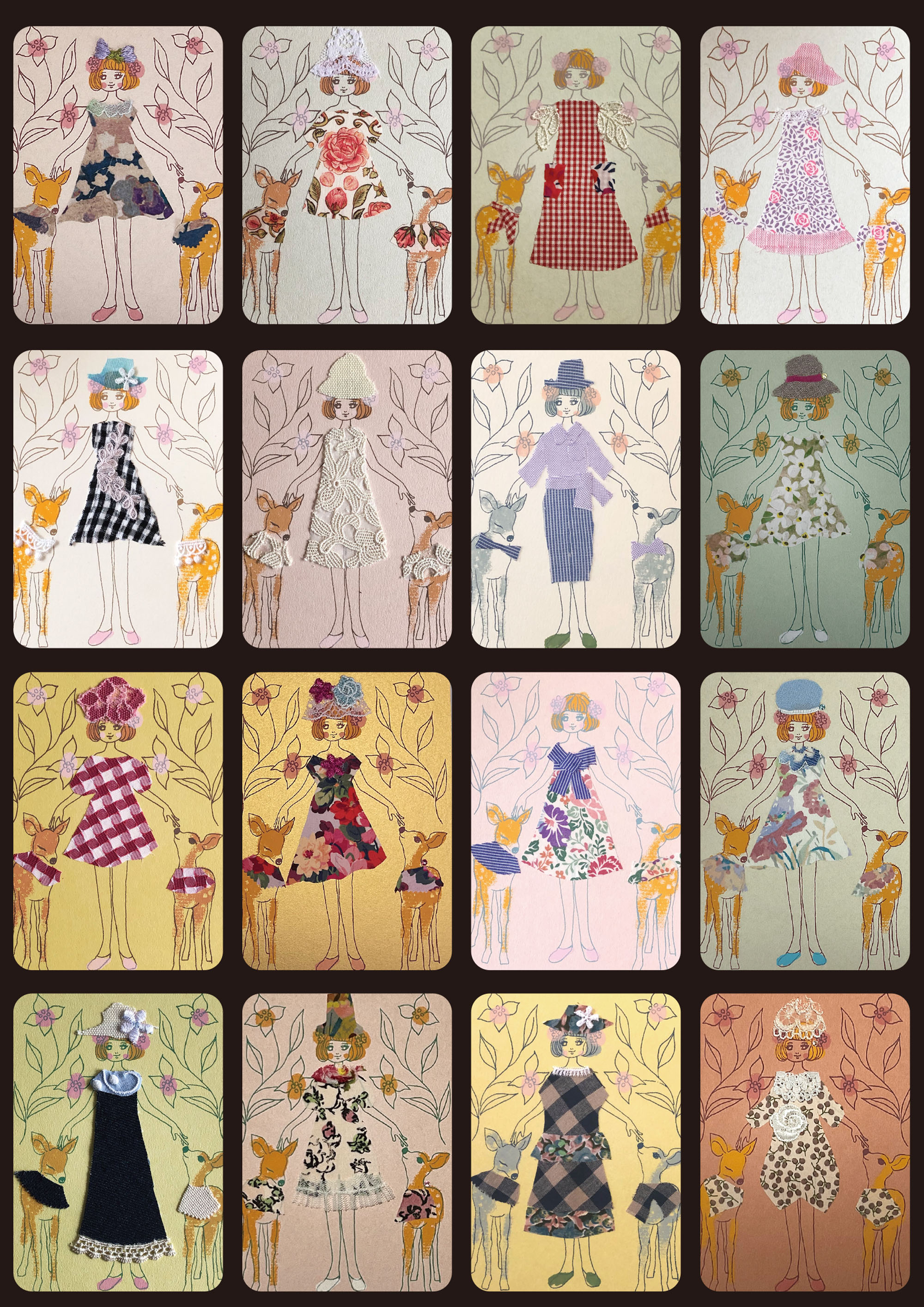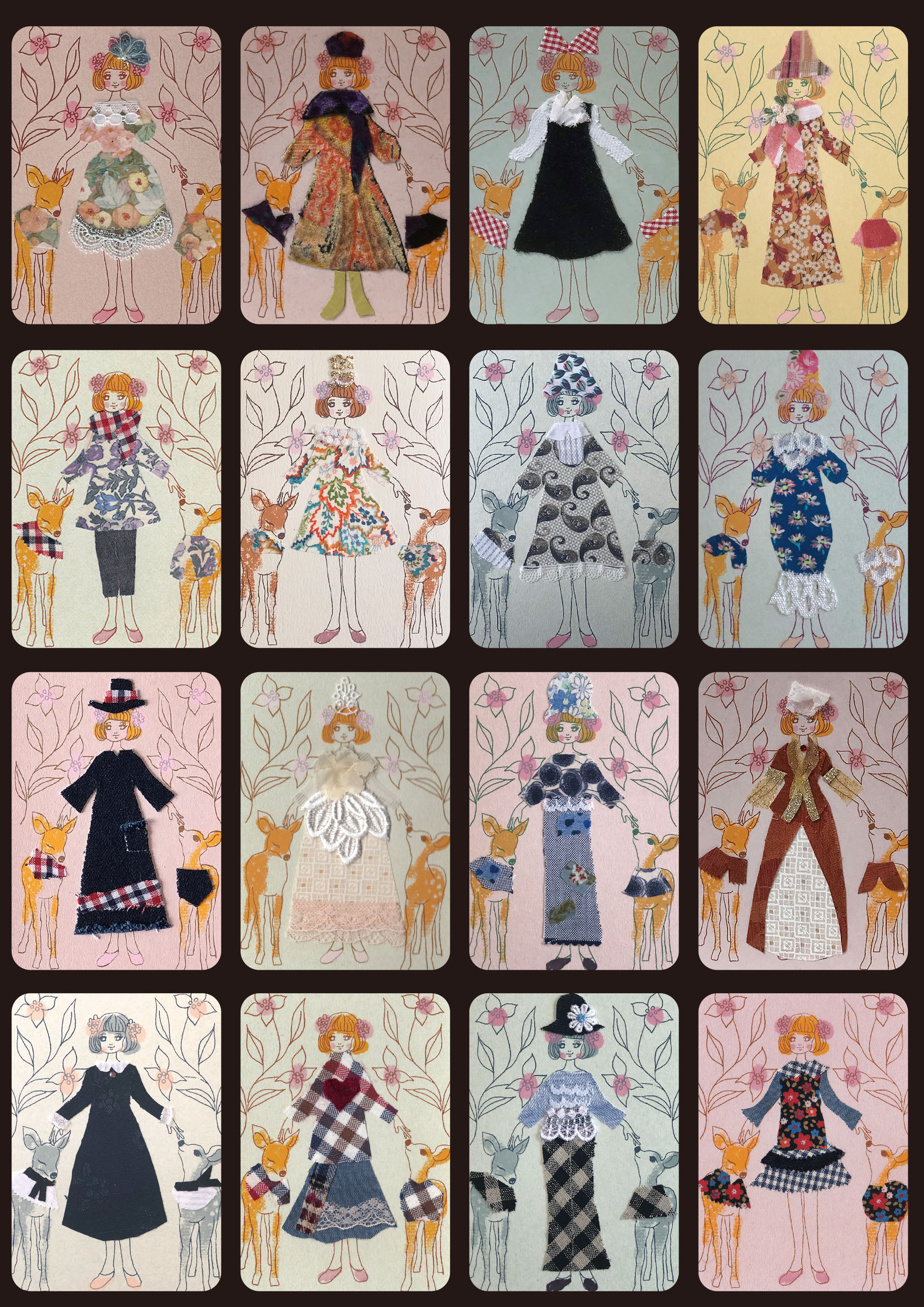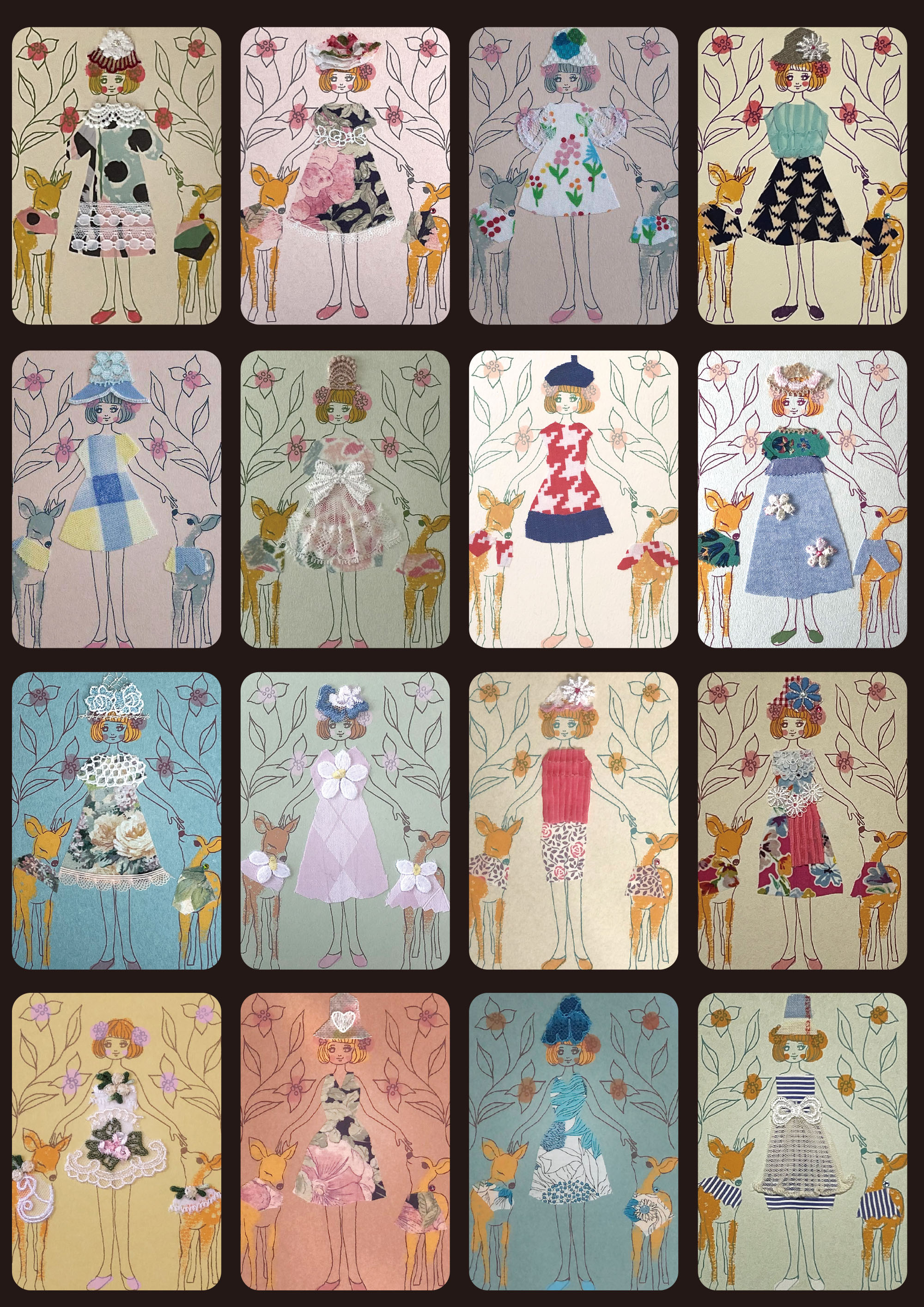 過去に制作したコラージュカードです(2019〜2023.4) Title "鹿ガール "鹿とペアルックの女の子です 紙と布とシルクスクリーン等...様々な素材のコラボ作品です Shika Girl Balloon Girl 風船を持った愛らしい女の子 Sofa My roomシリーズ