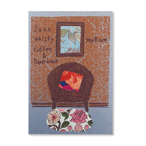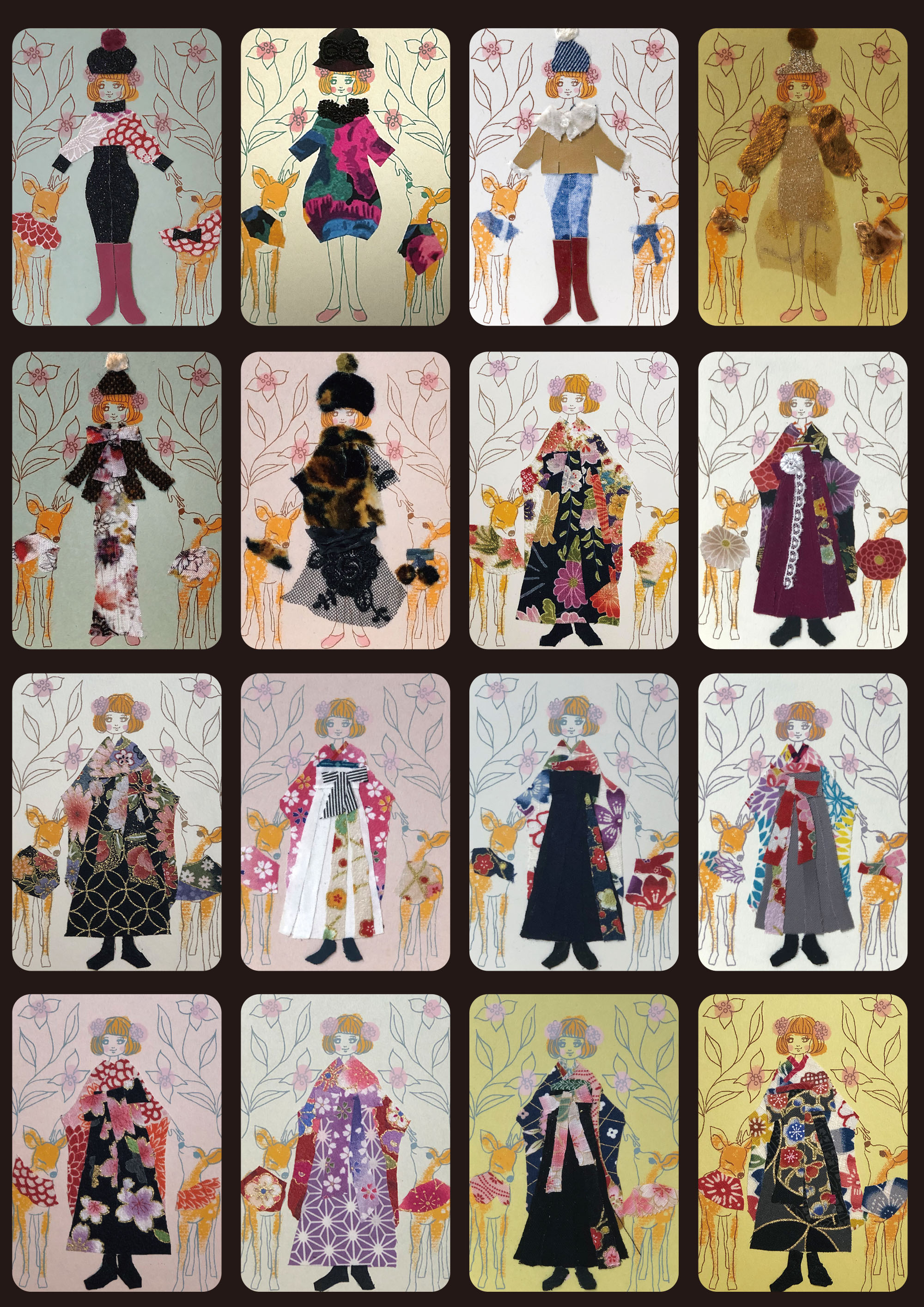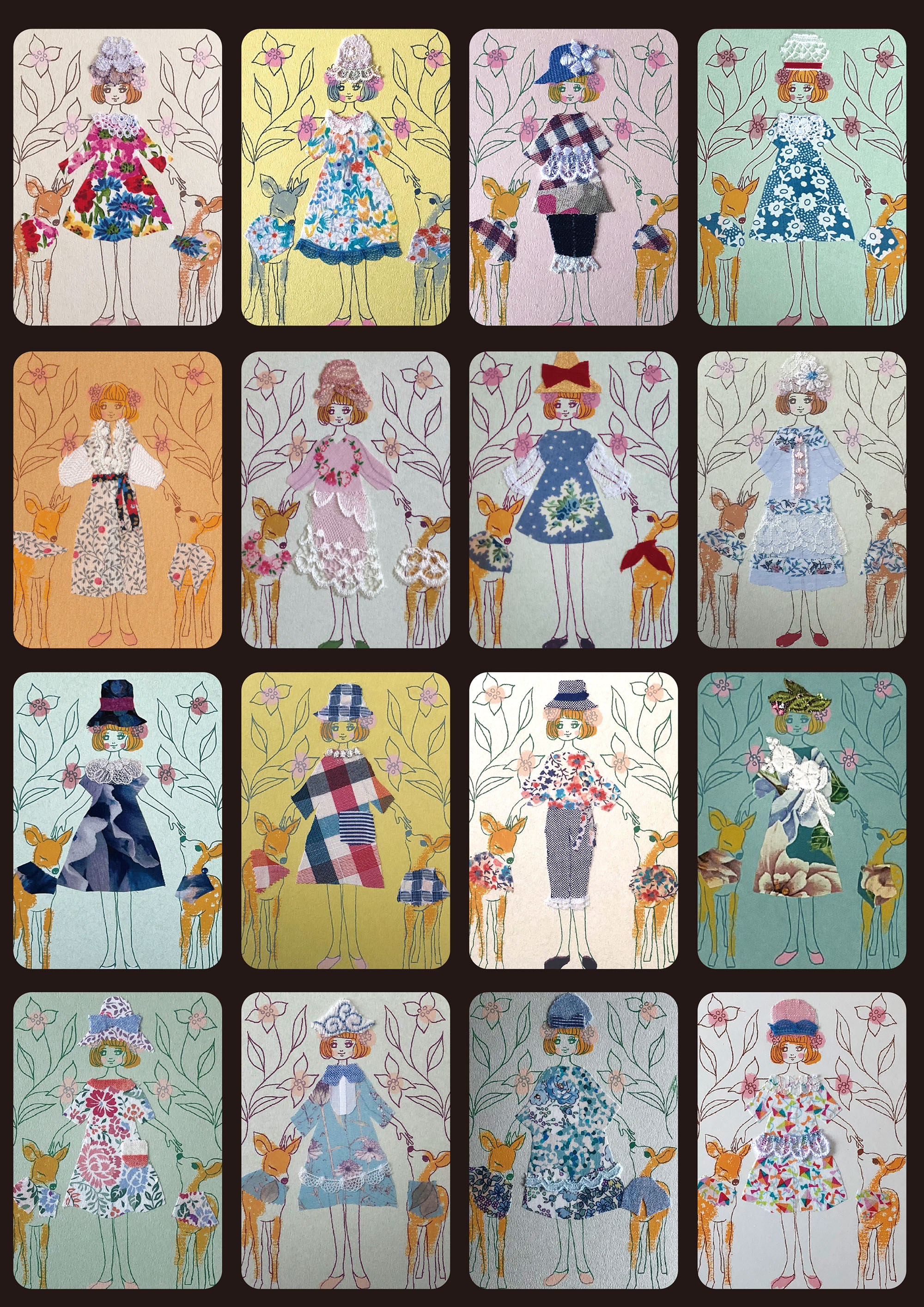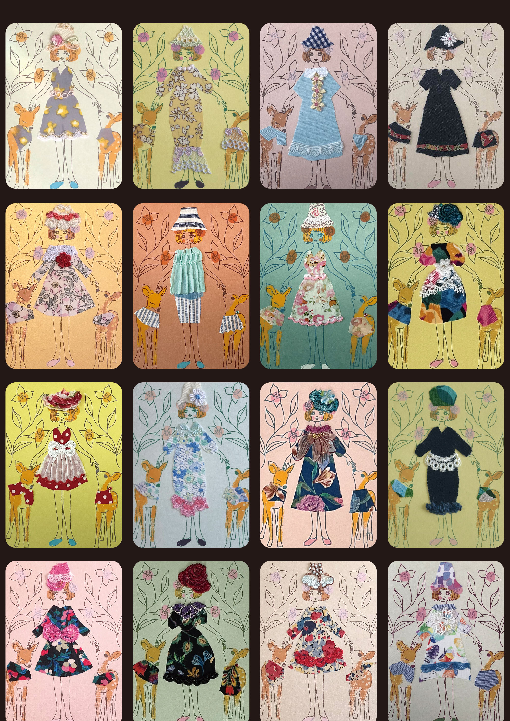 過去に制作したコラージュカードです(2019〜2023.4) Title "鹿ガール "鹿とペアルックの女の子です 紙と布とシルクスクリーン等...様々な素材のコラボ作品です Shika Girl Balloon Girl 風船を持った愛らしい女の子 Sofa My roomシリーズ